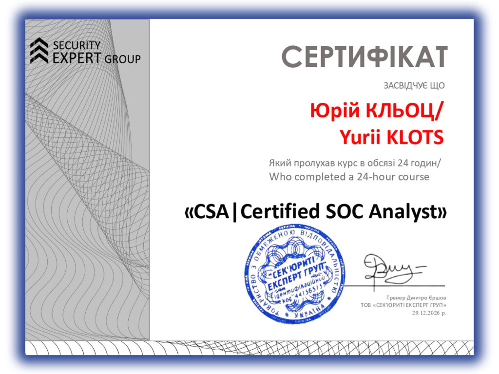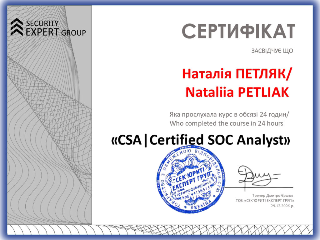 Курс Certified SOC Analyst (CSA) спрямований на формування практичних навичок роботи в центрі кібербезпеки та підготовку до отримання міжнародної сертифікації EC-Council, яка визнається роботодавцями у багатьох країнах.