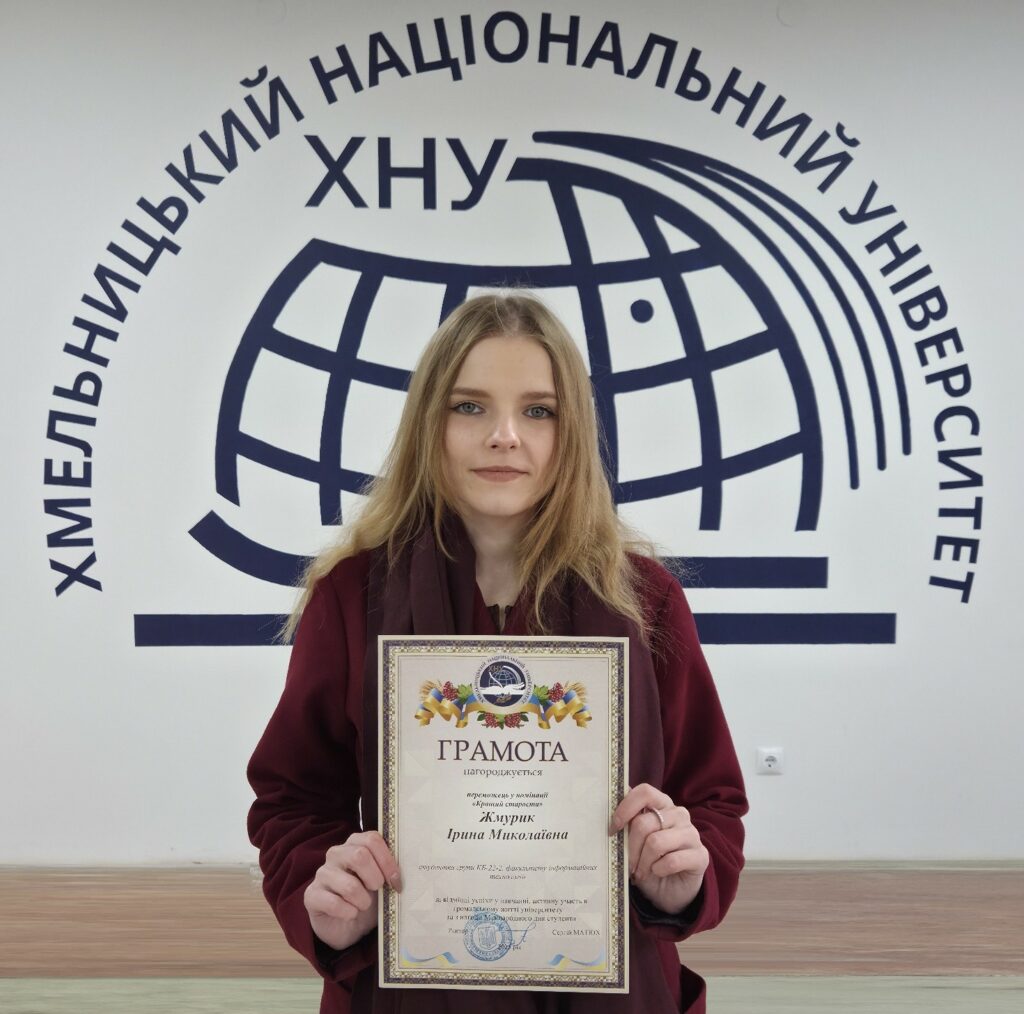 The faculty and student staff of the department sincerely congratulate Iryna on her brilliant victory in the prestigious student competition of KhNU. We wish Iryna new achievements, inspiration, and further success in her studies and public activities!