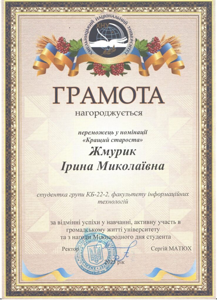 The award of the "OSCAR in Student Style 2025" competition is a well-deserved recognition of the exceptional leadership qualities of the group leader, tireless organizational work and high level of responsibility. For four years, Iryna has not only been successfully studying, but also daily demonstrates an example of dedication and effective communication, ensuring the coordinated work of the student group and maintaining communication between students and teachers.