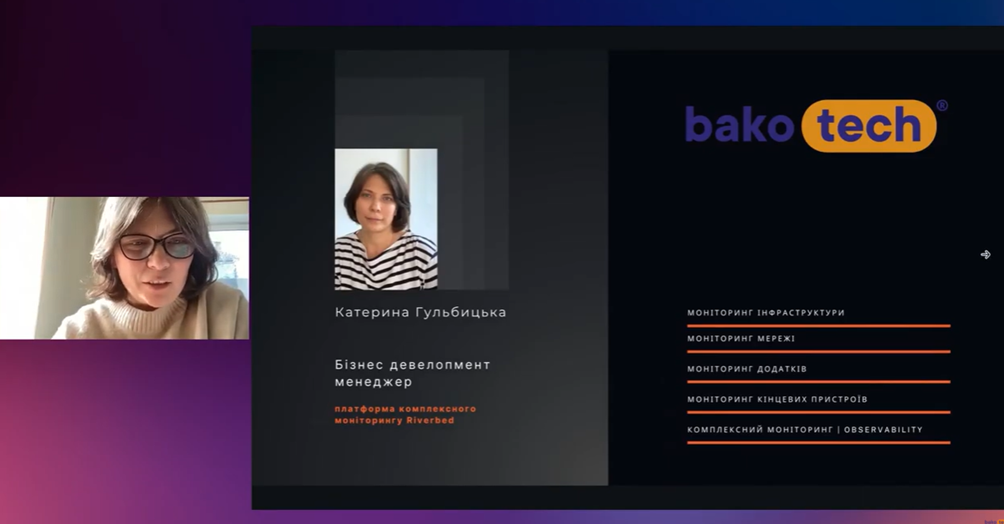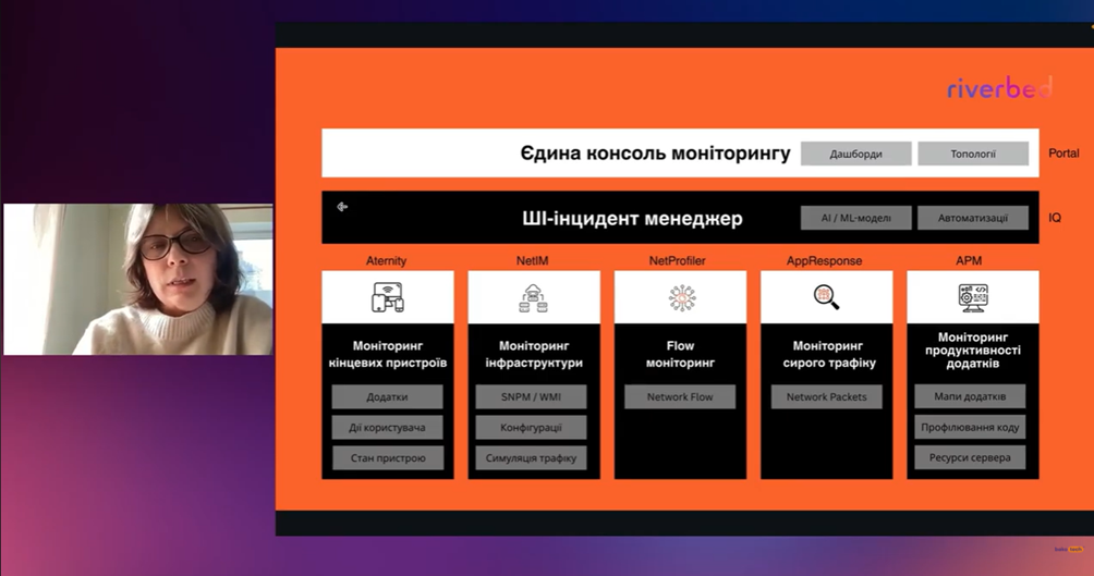The webinar speaker was Kateryna Gulbytska, a certified monitoring systems specialist and expert in implementing complex IT solutions. She presented a modern approach to network monitoring using the Riverbed platform as an example, which allows IT departments to monitor the entire infrastructure, from application performance to network connection status, in a single integrated environment.