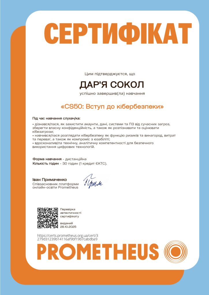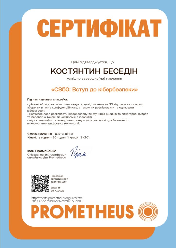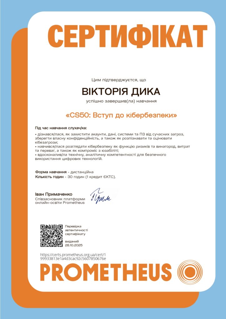 Студенти першого курсу спеціальності F5 «Кібербезпека та захист інформації» успішно завершили онлайн-курс «CS50: Вступ до кібербезпеки», створений професором Гарвардського університету доктором Девідом Маланом та адаптований українською мовою на платформі Prometheus.