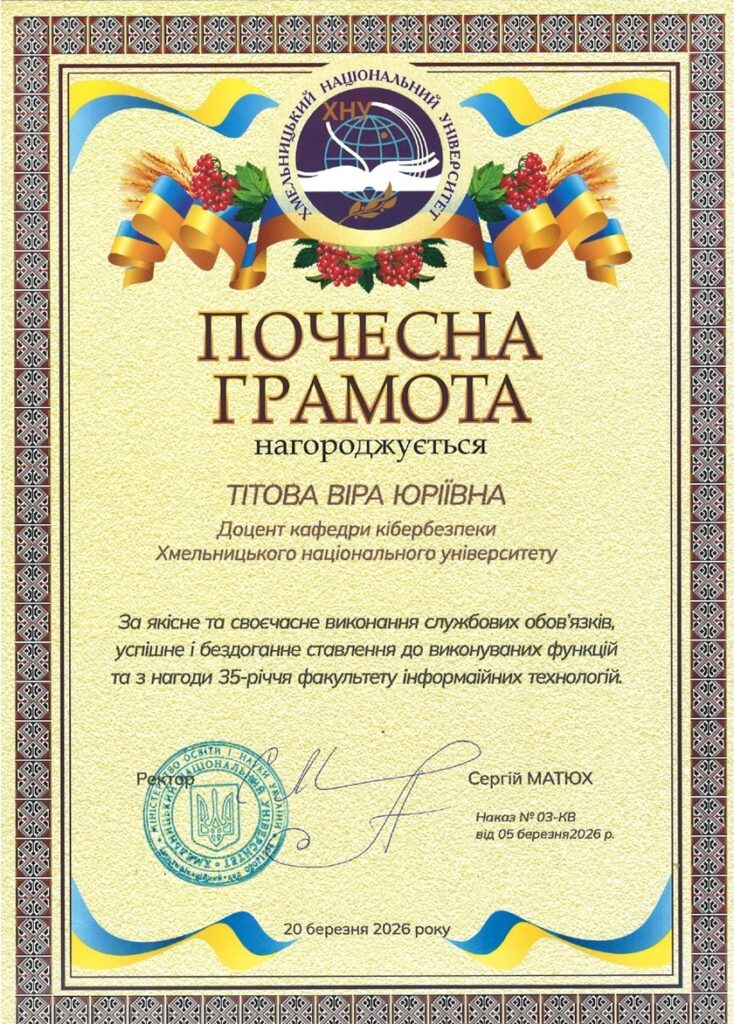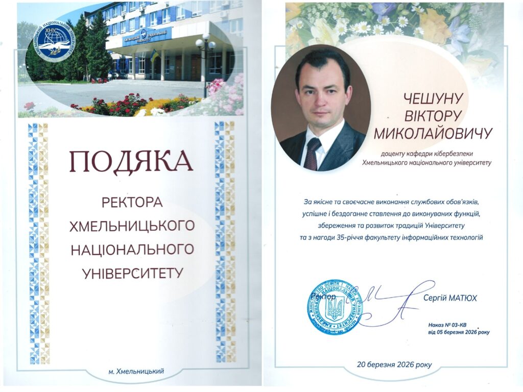 Особливо приємно, що серед нагороджених – представники кафедри кібербезпеки. Так, за своєчасне та якісне виконання службових обов’язків Віктора Чешуна було відзначено Подякою ректора, а Віру Тітову – нагороджено Почесною грамотою.
