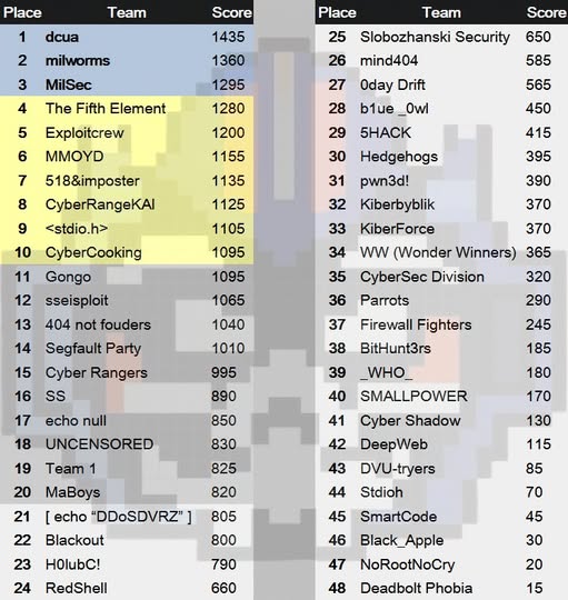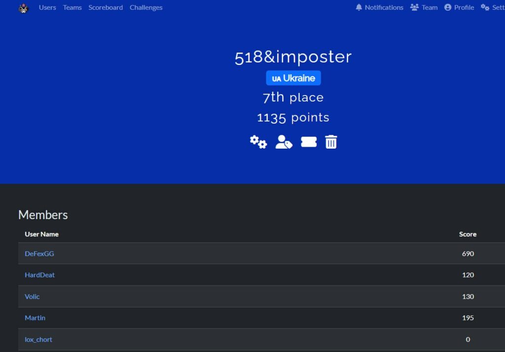Команда 518&imposter студентів кафедри кібербезпеки ХНУ в складі Стаднік Денис, Костюк Микола, Откидач Владислав, Олійник Володимир та Товт Растіслав здобула 7 місце в командному заліку.